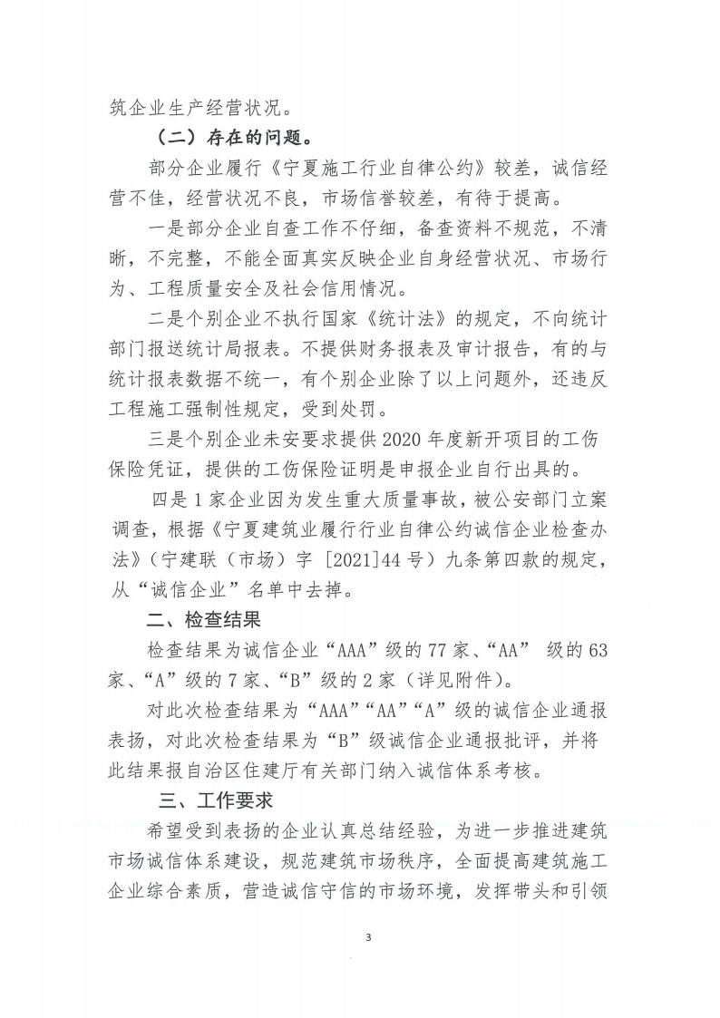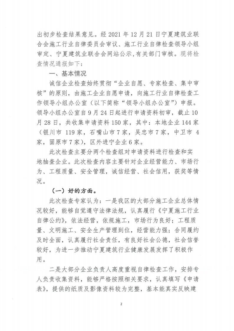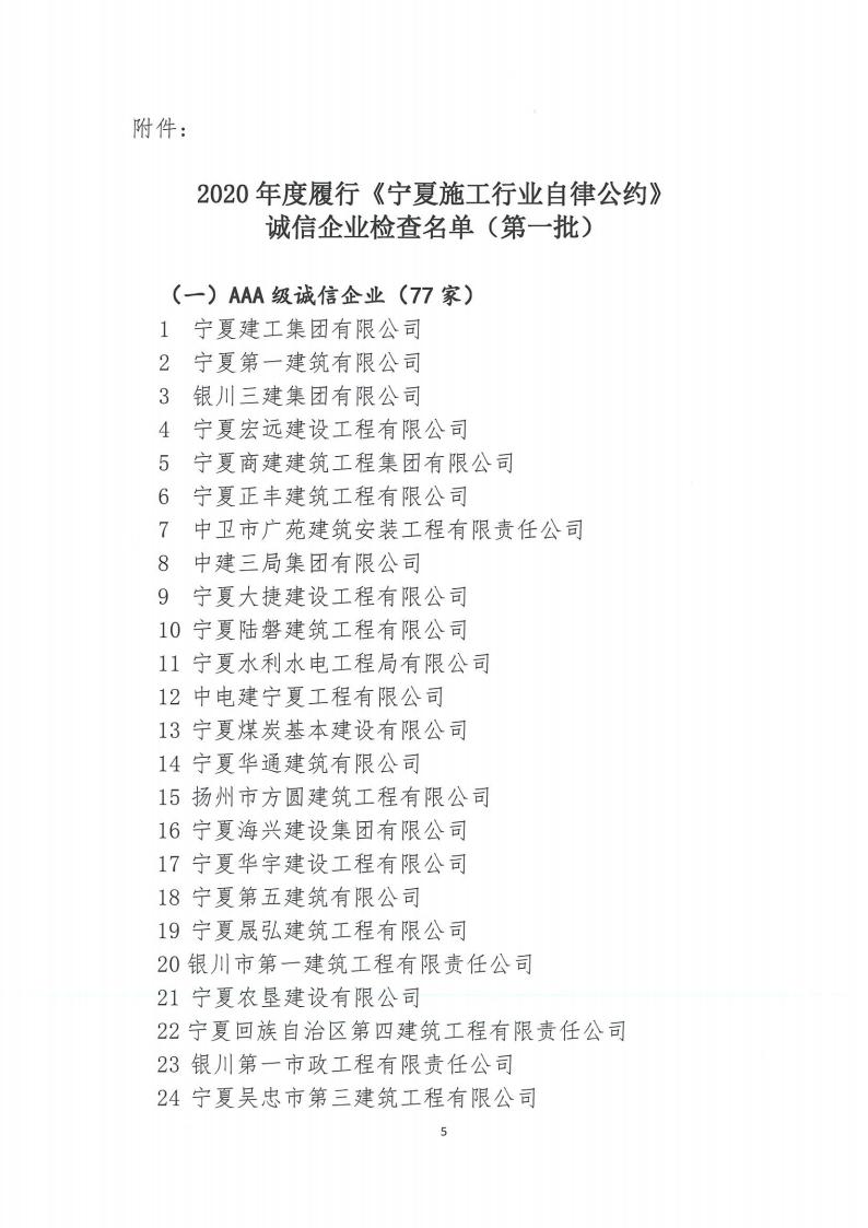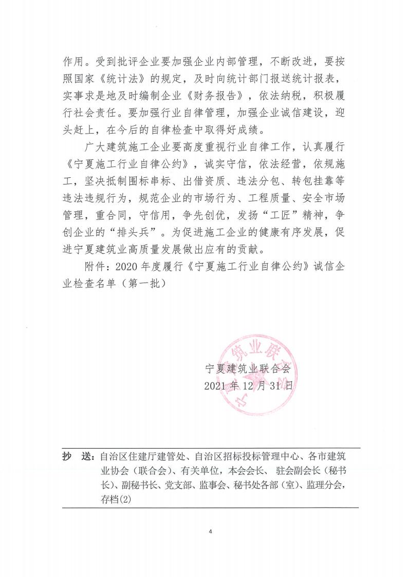 關(guān)于開展2020年度履行《寧夏施工行業(yè)自律公約》誠信企業(yè)檢查的通報(bào)(第一批)